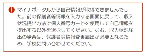 マイナポータルから自己情報が取得できませんでした。前の保護者等情報を入力する画面に戻って、収入状況提出方法で個人番号カードを使用して自己情報を提出する以外を選択してください。なお、収入状況届出の場合は、保護者等情報変更届出が必要となるため…